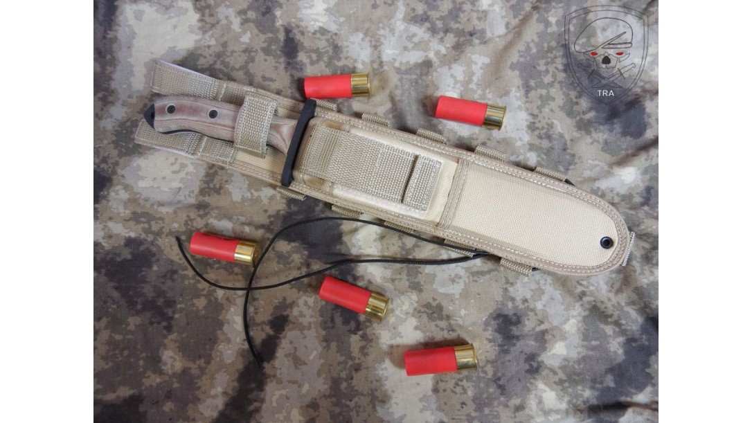 Sua bainha em cordura modular a prova d'água com um bolso frontal pra guardar itens de sobrevivência, pedra pra afiar etc.